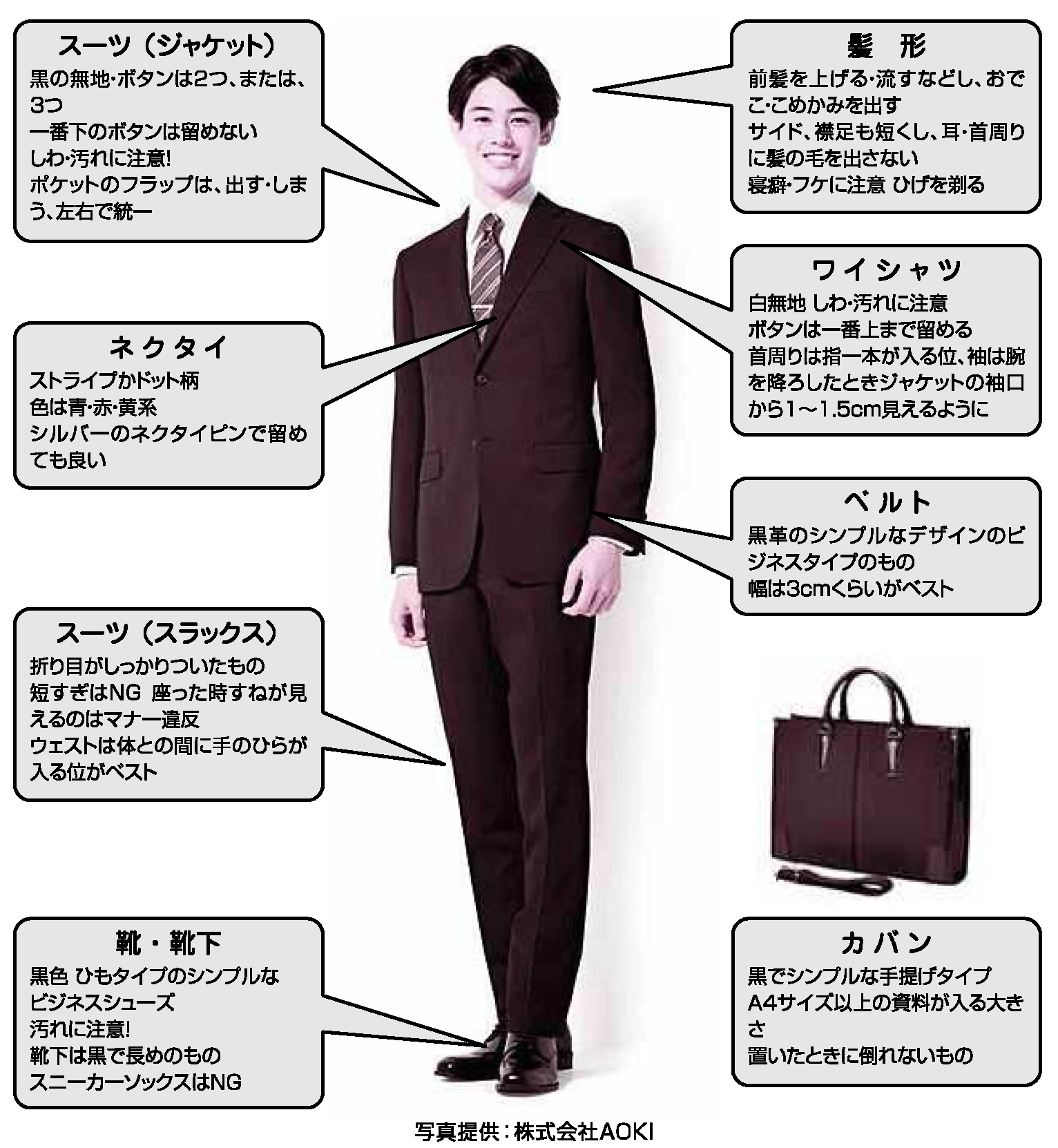 | スーツ | 基本黒色の無地で、ジャケットのボタンは2つまたは3つか。 |