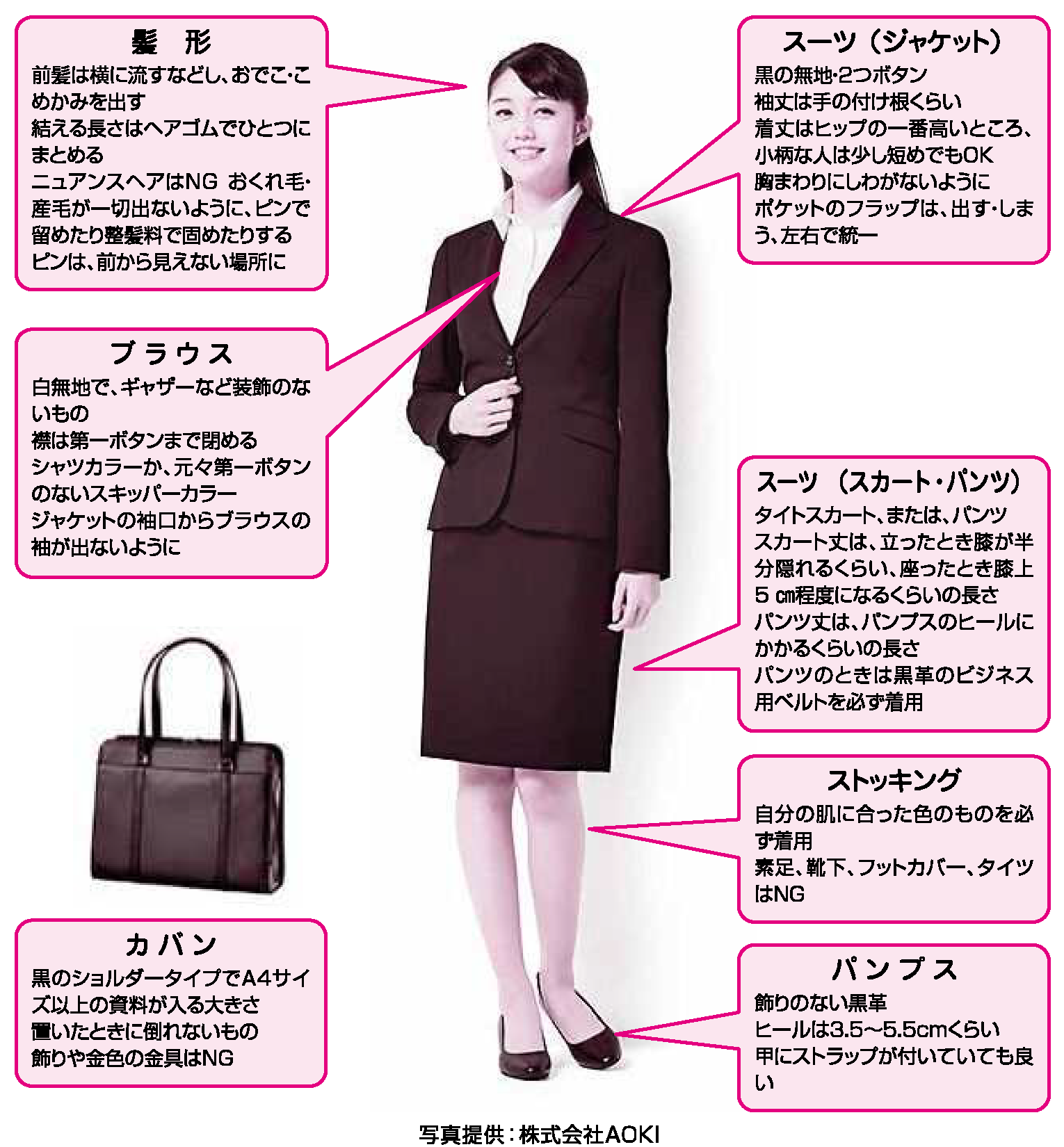 | ストッキング | 肌に合った色を着用しているか。 ※素足・ソックス・フットカバー・タイツはNG |